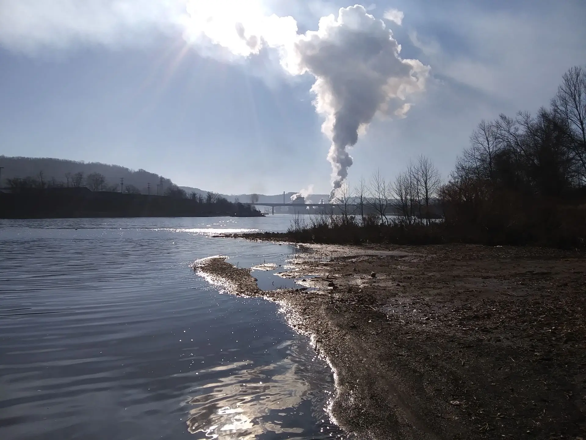 Photograph below is facing south on the Monongahela River in 2024 off Route 837. The center of the photo are emissions from the US Steel Clairton Coke Works' quench towers. Photo by Tom Bailey